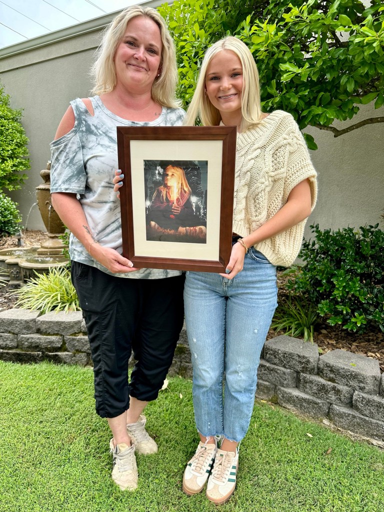 Jill and Zoey Hawkins pose with “The Little Girl with The Candle” photo.